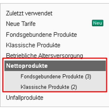 Um Nettotarife zu berechnen, müssen Sie in der Angebotssoftware (siehe Screenshot) auf den Bereich “Nettoprodukte” klicken.