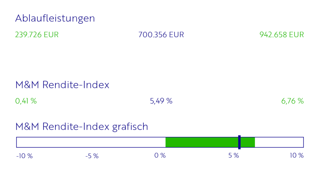 Die Altersvorsorgetarife werden an 10.000 Kapitalmarktszenarien bzw. -verläufen simuliert und somit deren Renditen bestimmt. Der M&M Rendite-Index stellt drei durchschnittliche Renditen dar. Ausgewiesen werden zusätzlich die aus den zugehörigen Renditen resultierenden Ablaufleistungen in Euro.