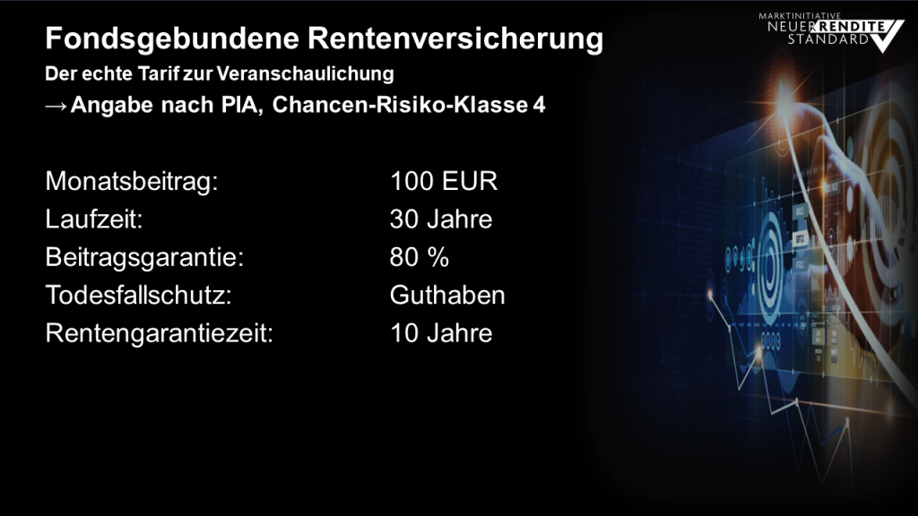 Nach diesem Muster könnten nicht wenige Altersvorsorge-Tarife abgeschlossen werden. Mit 30 Jahren Laufzeit hat diese Rentenversicherung eine realistische Chance, an Gewinnen der Kapitalmärkte zu partizipieren. Bei einer deutlich kürzeren Laufzeit müsste der Monatsbeitrag entsprechend höher ausfallen, um dies zu kompensieren.