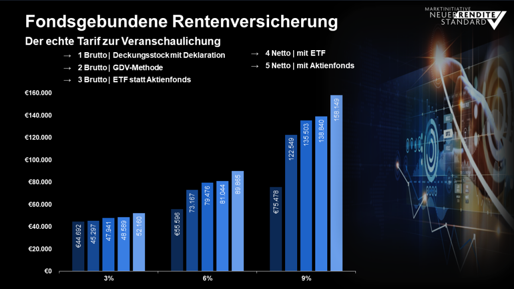 Die Leistungsspanne der Rentenversicherung reicht plötzlich von mageren 44.692 EUR bis hin zu 158.149 EUR. Damit hat derselbe Versicherungsvertrag eine Ergebnisspanne, die das Dreieinhalbfache des niedrigsten Ergebnisses beträgt, obwohl doch alle Hochrechnungsmethoden eine realistische Erwartung wecken wollen.