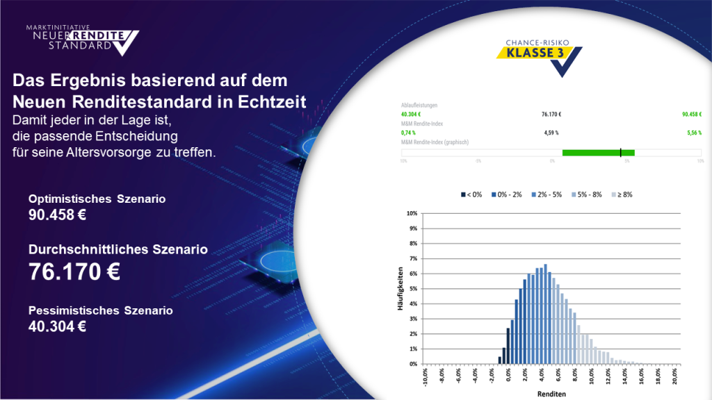 Es zeigt sich: Es gibt nicht mehr die eine Erwartung einer Auszahlungssumme. Stattdessen arbeitet der Neue Renditestandard mit drei Szenarien für die Ablaufleistung, jeweils angepasst an die individuelle Chancen-Risiko-Neigung des Kunden.