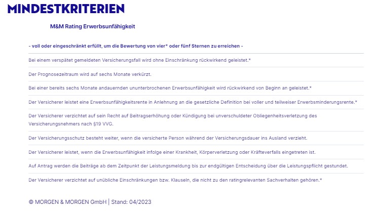 Seit 2019 analysiert MORGEN & MORGEN die Bedingungen der EU-Versicherer im Rahmen des M&M Ratings Erwerbsunfähigkeit. Insgesamt besteht die Bedingungsanalyse aus 45 Fragen. Davon sind 24 Fragen für das Rating relevant, die übrigen werden nachrichtlich ausgewiesen. Die ratingrelevanten Fragen beurteilen Sachverhalte und Produkteigenschaften, die als wesentlich für die Bedingungsqualität eines Produkts anzusehen sind. Die Kundenfreundlichkeit steht hier klar im Fokus, ebenso die Eindeutigkeit der Aussagen im Bedingungswerk.