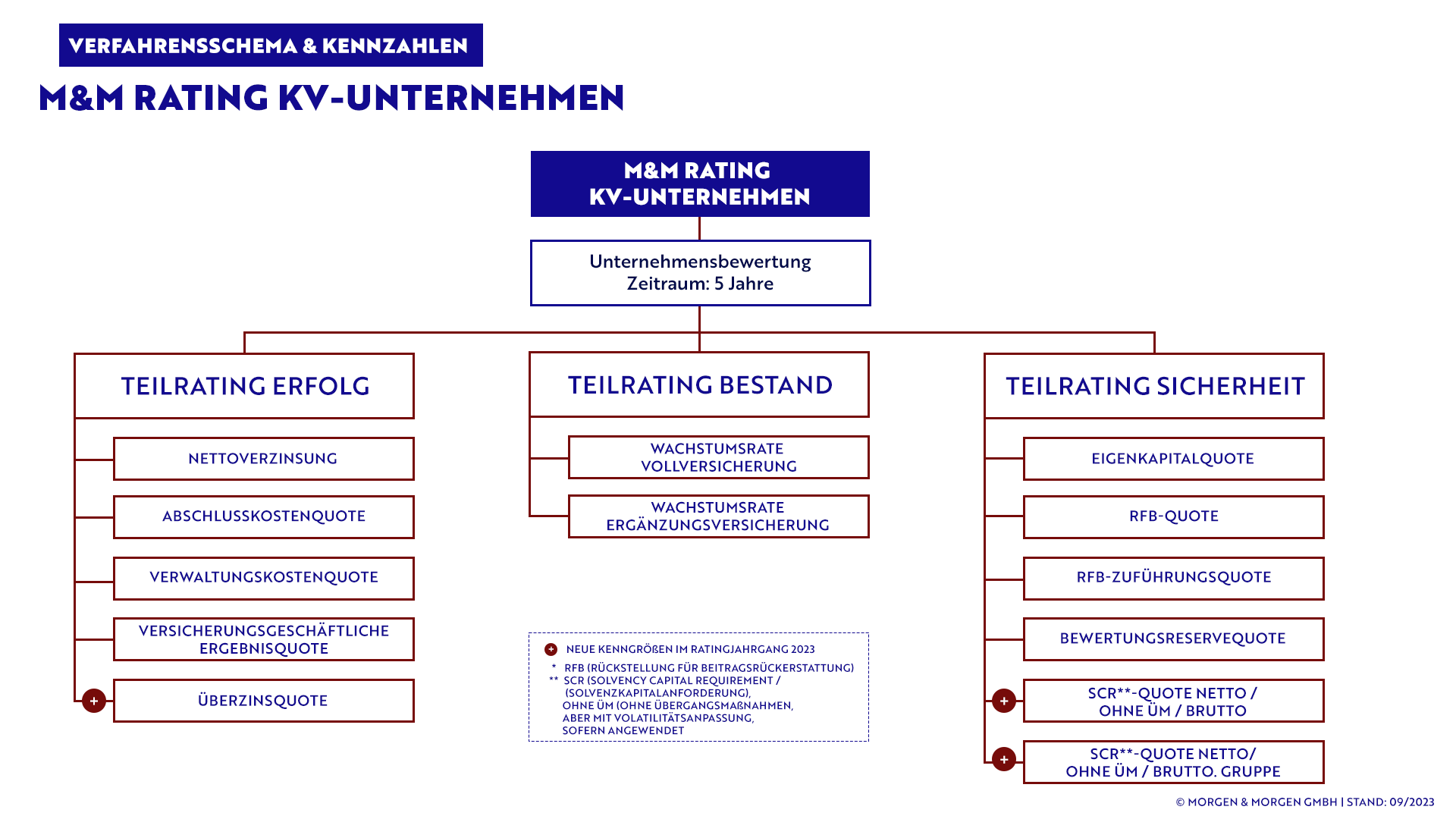 Als unabhängiges Analysehaus entwickelt MORGEN & MORGEN seine Ratings stets entsprechend der aktuellen Marktgegebenheiten und Beratungsbedarfe weiter. Aus diesem Grund hat das M&M Rating KV-Unternehmen in diesem Jahr eine Umstrukturierung erfahren. Das Gesamtrating setzt sich nun – analog zum bereits aktualisierten M&M Rating LV-Unternehmen – aus drei weiteren Teilratings zusammen: Erfolg, Sicherheit und Bestand. Neue Ratingbestandteile sind dabei die Solvency II-Kennzahlen im Teilrating Sicherheit sowie die Überzinsquote für das Teilrating Erfolg. Das ermöglicht ergänzend zu dem Gesamtblick auf das Unternehmen einen Einblick in die wesentlichen Kennzahlen.