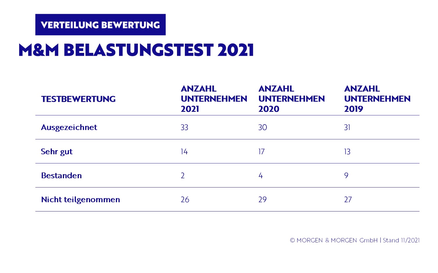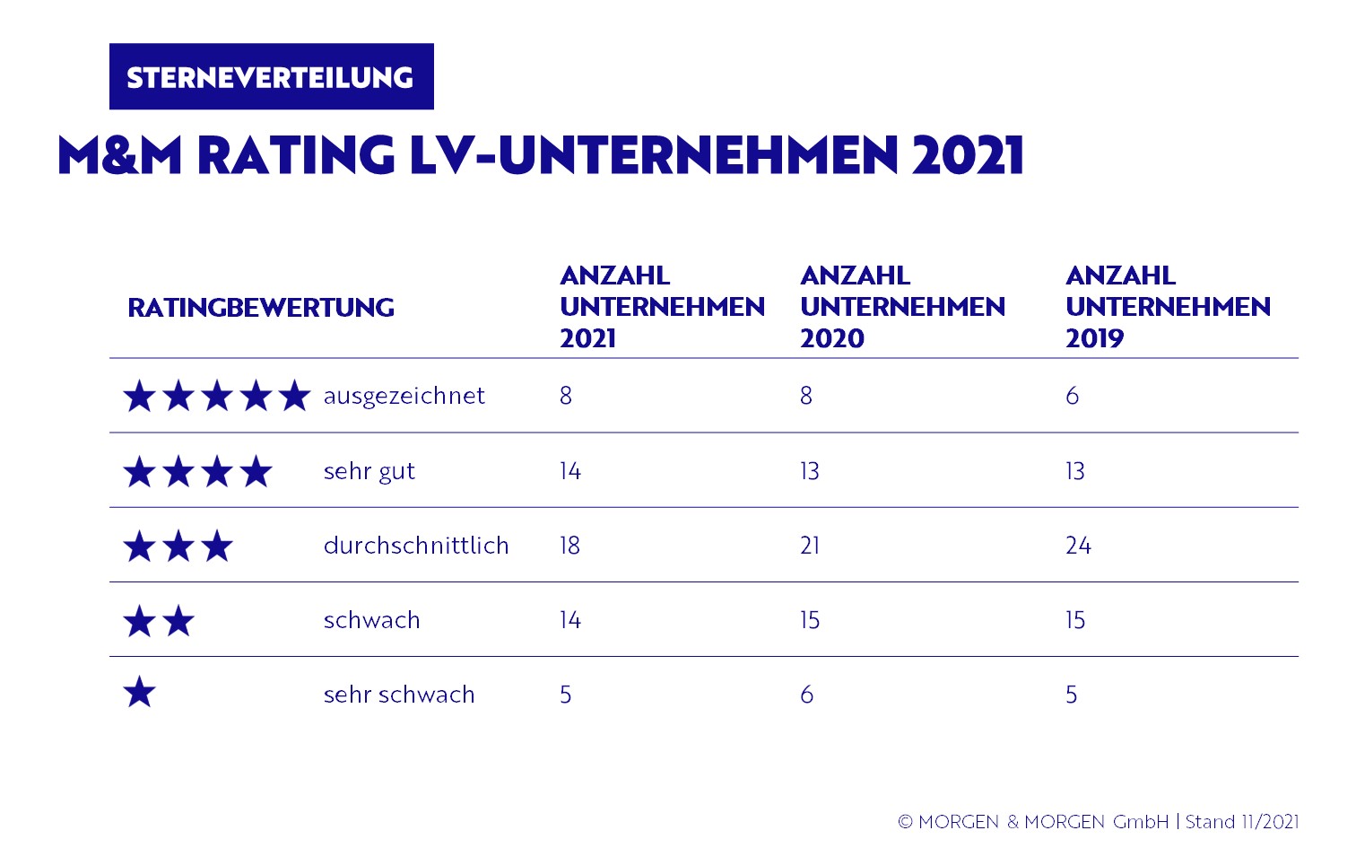 | Bewertung | Anzahl Unternehmen 2021 | Anzahl Unternehmen 2020 | Anzahl Unternehmen 2019 |