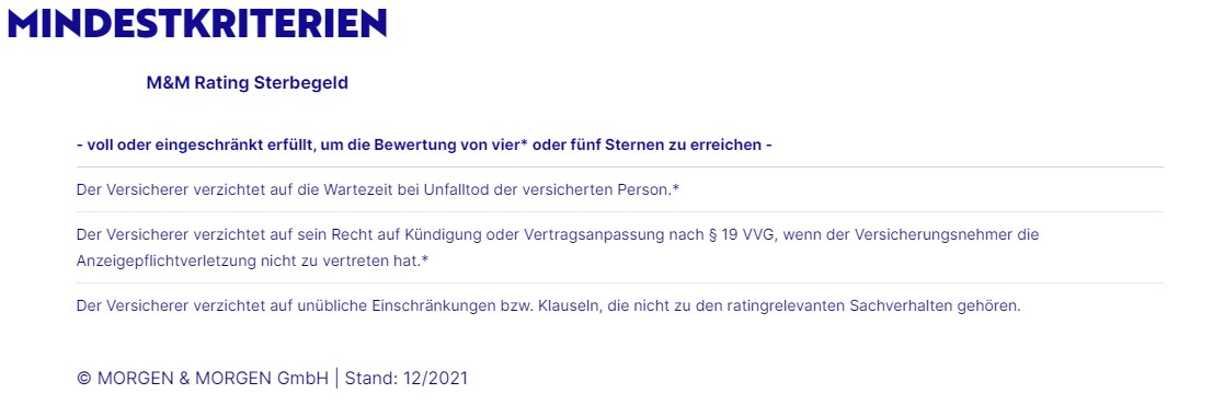 Die von MORGEN & MORGEN angesetzten Mindestkriterien stellen daher sicher, dass die top bewerteten Tarife folgende Bedingungen erfüllen: Der Versicherer sieht bei einem 5-Sterne-Tarif von der Wartezeit bei Unfalltod der versicherten Person ab. Für die Bestbewertung verzichtet der Versicherer außerdem auf eine Gesundheitsprüfung oder auf sein Recht auf Kündigung oder Vertragsanpassung nach § 19 VVG, wenn der Versicherungsnehmer die Anzeigepflichtverletzung nicht zu vertreten hat.