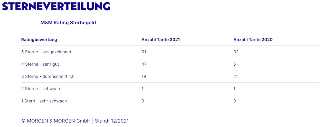 MORGEN & MORGEN analysiert die Sterbegeldtarife im Rahmen des M&M Rating Sterbegeld seit 2020. Die Bedingungsanalyse besteht aus 17 Fragen, wobei 11 Fragen ratingrelevant sind und Sachverhalte und Produkteigenschaften beurteilen, die als wesentlich für die Qualität eines Sterbegeld-Versicherungsproduktes anzusehen sind. Da es sich bei der Zielgruppe für Sterbegeldtarife in der Regel um ältere Personen handelt, liegt ein Schwerpunkt des M&M Ratings Sterbegeldversicherung bei den Themen Wartezeit und Gesundheitsprüfung. Positiv bewertet sind vor allem Tarife ohne Gesundheitsprüfung und mit angemessen kurzer Wartezeit, wobei auch Staffelregelungen Berücksichtigung finden. Zudem spielt es eine Rolle, ob die Versicherer bei Unfalltod der versicherten Person innerhalb der Wartezeit ihre volle Versicherungsleistung erbringen. Vertragliche Gestaltungsalternativen, wie Reduzierungsmöglichkeiten des Versicherungsschutzes und Überbrückungsmöglichkeiten bei Zahlungsschwierigkeiten, werden ebenfalls als wichtig angesehen. Positiven Eingang in die Beurteilung fanden Tarife, welche die Erstattung von Überführungskosten bei Versterben der versicherten Person im Ausland bieten. Pluspunkte gibt es auch für Assistanceleistungen, die in unterschiedlichem Umfang von den Unternehmen angeboten werden, wie Beratung zu Testaments- und Nachlassfragen, Digitale Nachlassverwalter, Vermittlung von Grabpflege, Vermittlung von Bestattern, um nur einige zu nennen. Ausnahmen dabei sind Tarife, die wahlweise die vollständige Auszahlung der Versicherungsleistung oder ein komplettes Servicepaket für die Bestattung anbieten, dessen Leistungen mit der Versicherungssumme verrechnet werden.