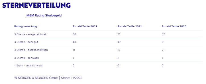 Die Sterbegeldversicherung dient der finanziellen Entlastung der Hinterbliebenen und ist darauf ausgelegt, anfallende Kosten rund um den Todesfall aufzufangen. Nach dem Tod benötigen Hinterbliebene beispielsweise Beratung zu Testaments- und Nachlassfragen oder eine Vermittlung von Bestattern. Auch der digitale Nachlassverwalter wird immer wichtiger. Das alles verursacht Kosten, die durchschnittlich zwischen 7.000 bis 10.000 Euro liegen. Wer seine Angehörigen für den Fall seines Todes entlasten möchte und die eigenen Wünsche für die zukünftige Bestattung finanziell absichern möchte, kann mit einer Sterbegeldversicherung vorsorgen und dabei die Höhe der Versicherungssumme den individuellen Wünschen anpassen. Sie wird daher hauptsächlich von älteren Menschen abgeschlossen. „Der rückläufige Trend setzt sich auch in diesem Jahr fort. 2021 haben wir 98 Tarife bewertet. Heute sind es nur noch 89“, stellt Andreas Ludwig, Bereichsleiter Rating & Analyse bei MORGEN&MORGEN, fest und mutmaßt: „Dies sei sicherlich auch dem niedrigen Rechnungszins geschuldet, der es den Versicherern erschwert, die eingezahlten Beiträge zu erhalten.“ Insgesamt bietet der Markt aber mit 89 Tarifen immer noch ein vielfältiges Angebot. Den passenden Tarif auszuwählen, erweist sich oft als schwierig. Das M&M Rating Sterbegeld gibt Orientierung und zeigt, welche Tarife besonders gute Bedingungen aufweisen.