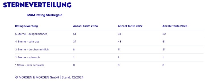 MORGEN & MORGEN analysiert die Sterbegeldtarife im Rahmen des M&M Rating Sterbegeld seit 2020. Die Bedingungsanalyse besteht aus 17 Fragen, wobei 11 Fragen ratingrelevant sind und Sachverhalte und Produkteigenschaften beurteilen, die als wesentlich für die Qualität eines Sterbegeld-Versicherungsproduktes anzusehen sind. Da es sich bei der Zielgruppe für Sterbegeldtarife in der Regel um ältere Personen handelt, liegt ein Schwerpunkt des M&M Ratings Sterbegeldversicherung bei den Themen Wartezeit und Gesundheitsprüfung. Positiv bewertet sind vor allem Tarife ohne Gesundheitsprüfung und mit angemessen kurzer Wartezeit, wobei auch Staffelregelungen Berücksichtigung finden. Zudem spielt es eine Rolle, ob die Versicherer bei Unfalltod der versicherten Person innerhalb der Wartezeit ihre volle Versicherungsleistung erbringen. Vertragliche Gestaltungsalternativen wie Reduzierungsmöglichkeiten des Versicherungsschutzes und Überbrückungsmöglichkeiten bei Zahlungsschwierigkeiten, werden ebenfalls als wichtig angesehen. Positiven Eingang in die Beurteilung fanden Tarife, welche die Erstattung von Überführungskosten bei Versterben der versicherten Person im Ausland bieten. Pluspunkte gibt es auch für Assistanceleistungen, die in unterschiedlichem Umfang von den Unternehmen angeboten werden, wie Beratung zu Testaments- und Nachlassfragen, digitale Nachlassverwalter, Vermittlung von Grabpflege, Vermittlung von Bestattern, um nur einige zu nennen. Ausnahmen dabei sind Tarife, die wahlweise die vollständige Auszahlung der Versicherungsleistung oder ein komplettes Servicepaket für die Bestattung anbieten, dessen Leistungen mit der Versicherungssumme verrechnet werden.