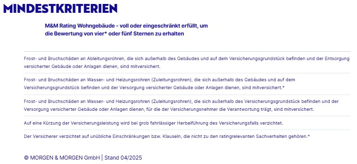 Das M&M Rating Wohngebäude ist tarifbezogen und beinhaltet ausschließlich die Bedingungsanalyse auf Basis der einzelnen Tarife. Das Rating eines Tarifs wird mit einem (sehr schwach) bis fünf (ausgezeichnet) Sternen bewertet. Die Bedingungen werden anhand von 50 Leistungsfragen bewertet. Die im M&M Rating angesetzten Mindestkriterien stehen für einen umfassenden Versicherungsschutz und zeigen die Qualität der Wohngebäudetarife, die mit vier oder fünf Sternen bewertet sind.
