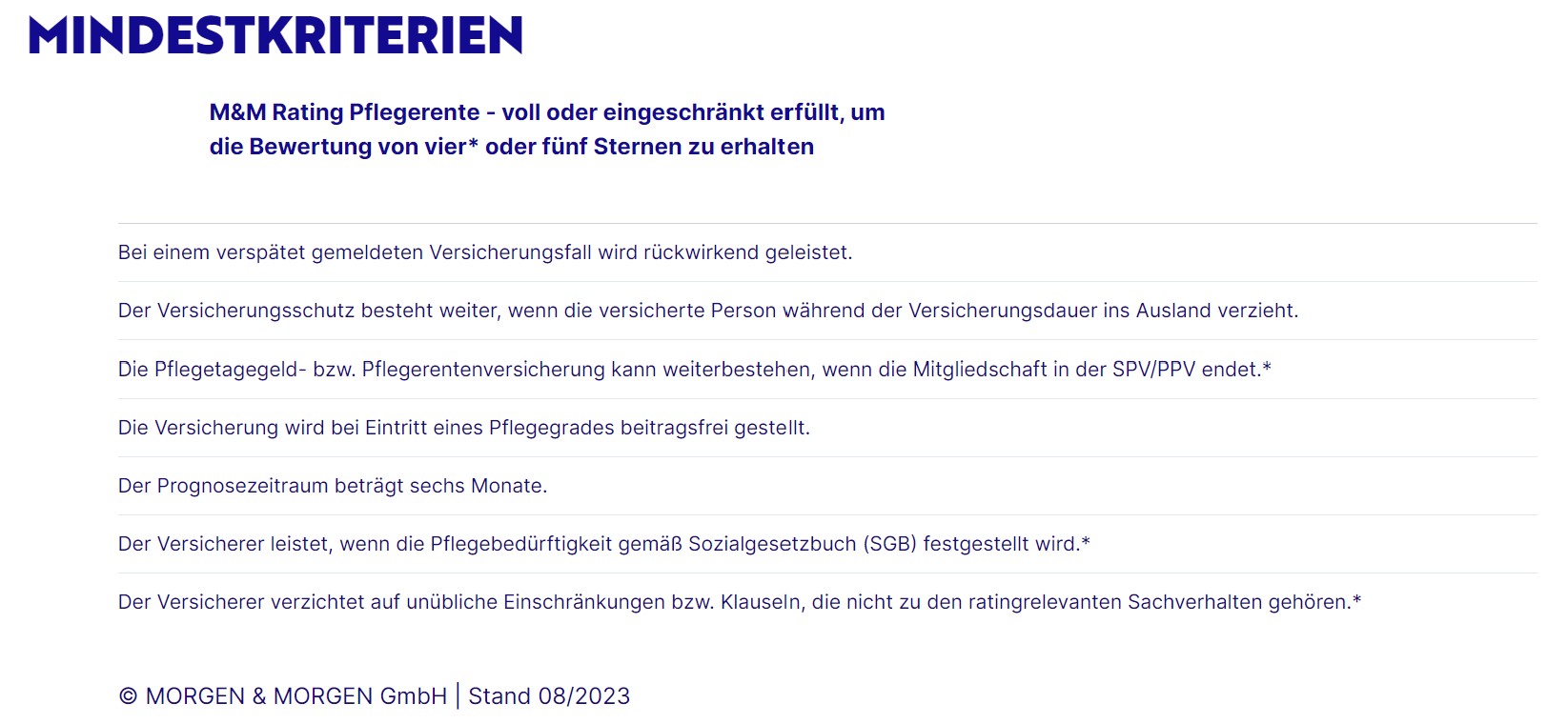 M&M Rating Pflegetagegeld – voll oder eingeschränkt erfüllt, um die Bewertung von vier* oder fünf Sternen zu erhalten