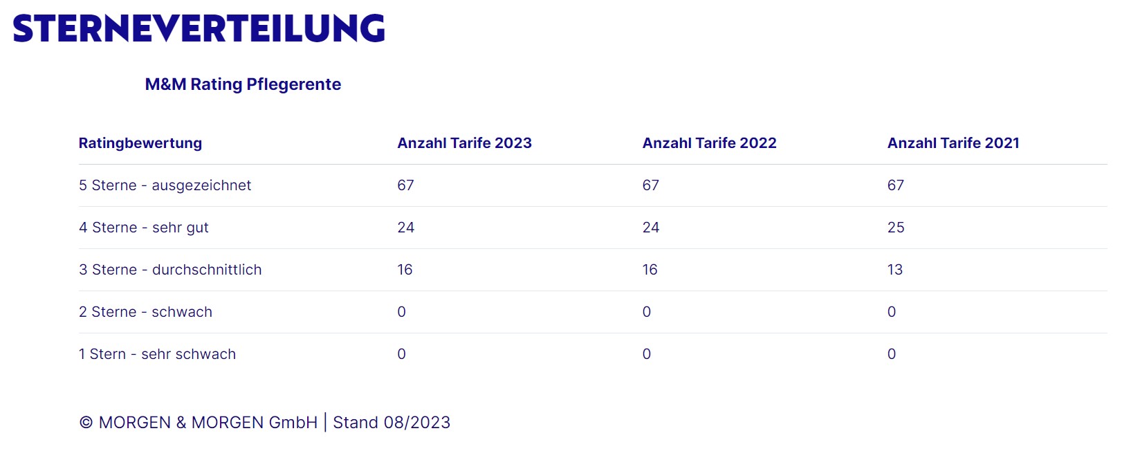 Trotz der unlängst beschlossenen Erhöhung der Leistungszuschläge sowie beim Pflegegeld und bei den Pflegesachleistungen strapaziert eine längerfristige Pflege die finanziellen Ressourcen der betroffenen Personen. Begründet liegt dies, neben der allgemeinen Inflation, auch in den Preissteigerungen von Pflegeheimen oder einer ambulanten Pflege. „Die Notwendigkeit einer privaten Pflegeabsicherung ist damit größer denn je,“ fasst Thorsten Bohrmann die aktuellen Entwicklungen zusammen. „Das zeigt sich insbesondere bei der Anpassung der Pflegetagegelder mit zahlreichen neuen Tarifen und Bedingungsständen.“ Nicht immer kann das unabhängige Analysehaus dabei eine positive Veränderung feststellen: In diesem Jahrgang ist ein deutlicher Abwärtstrend in der Sterneverteilung des M&M Ratings Pflegetagegeld festzustellen. MORGEN & MORGEN betont, dass dies nicht durch eine Verschärfung der Ratingfragen zustande kommt. Vielmehr liegt dies an teilweise deutlichen Einschränkungen der Leistungsbedingungen, was nicht im Interesse der Versicherungsnehmer ist.