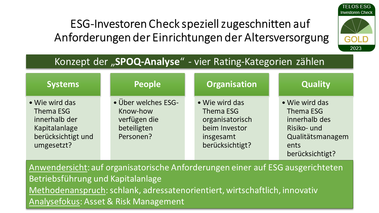 Gerade um den speziellen Anforderungen von Investoren wie Altersversorgungseinrichtungen entsprechen zu können, wurde kürzlich von Prof. Schäfer und TELOS der „ESG Investoren Check“ entwickelt. Dieser „ESG-Röntgenschirm“ folgt der über Jahrzehnte bewährten holistischen Vorgehensweise der TELOS GmbH bei ihren Analysen von Asset Managern und Ownern, abgestützt durch das langjährige ESG-Know how und die wissenschaftliche Kompetenz von EccoWorks: Prof. Dr. Henry Schäfer. Herzstück des ESG-Checks ist der SPOQ-Ansatz (s. Abbildung), wie er sich bereits für den ESG-Check von Mandaten und Spezialfonds bestens bewährt hat. Mit ihm wird den besonderen Anforderungen von auf Nachhaltigkeit ausgerichteten Pensionskassen, Versorgungswerken u.a. gerade auch unter Kostengesichtspunkten Rechnung getragen. Erste Anwendungen durch Altersversorgungseinrichtungen haben ein sehr positives Echo hervorgebracht.