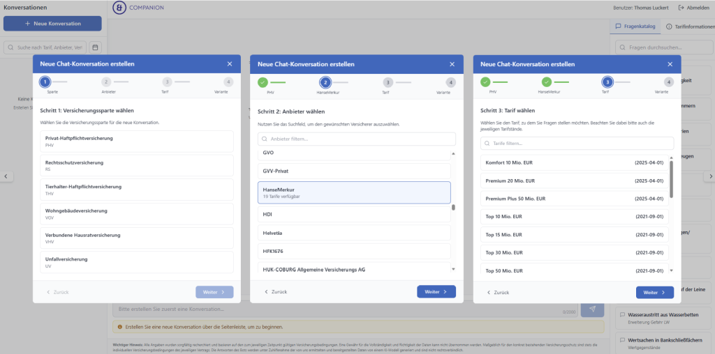 Der M&M Companion ist Ihre KI für Beratung, Service und Vertrieb. Er liefert Antworten zu Tarifbedingungen aus der M&M Datenbank. Keine halluzinierten Aussagen, sondern verlässliche und geprüfte Daten. Dank KI kann er jedoch flexibel auf komplexe Anfragen reagieren. So unterstützt der M&M Companion Sie professionell und verlässlich bei der Vorbereitung von Vertriebs- und Umdeckungsaktionen:
