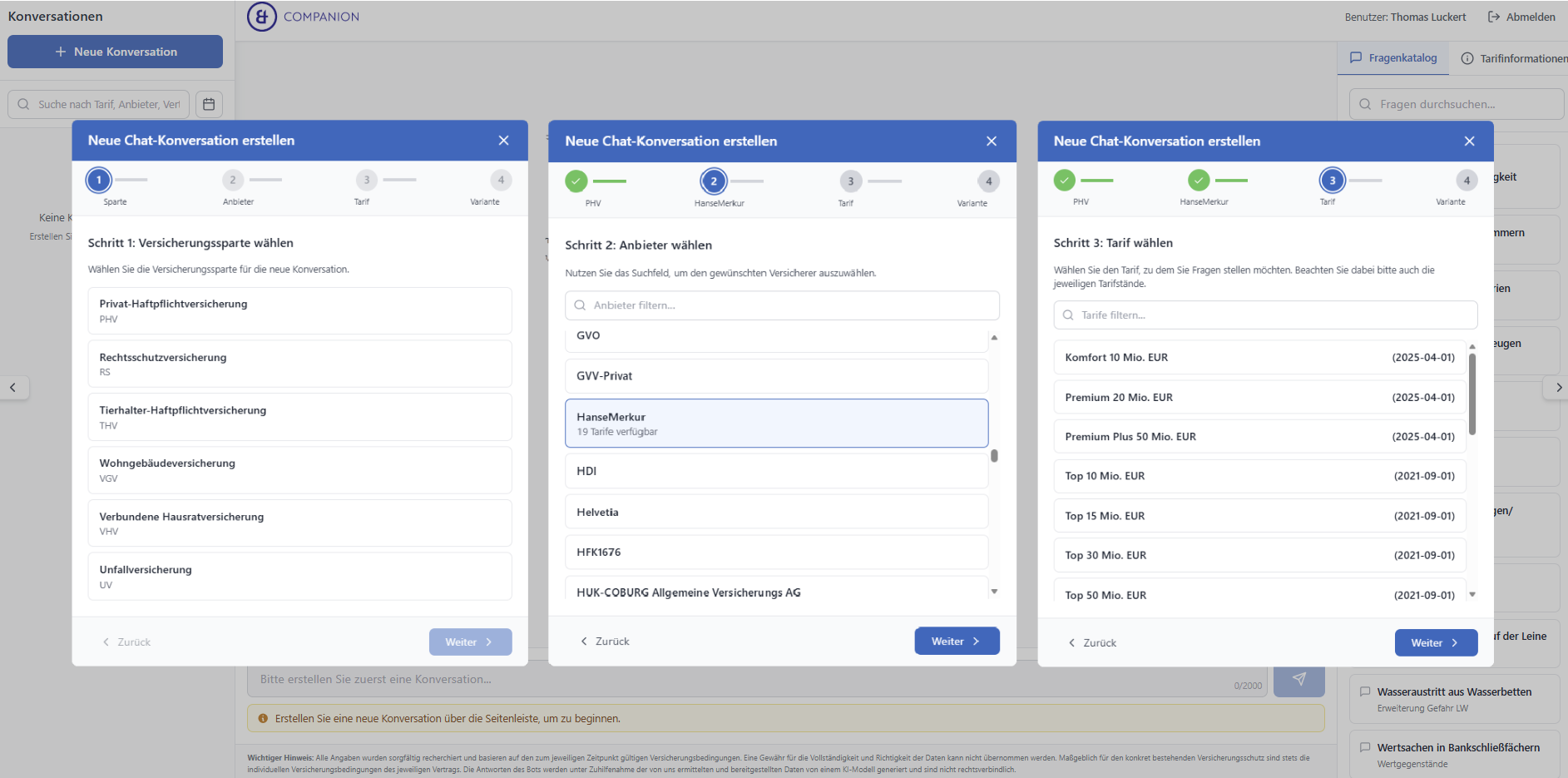 Der M&M Companion ist ein KI-gestützter Fachassistent, der gezielte Fragen zu Tarif- und Leistungsinhalten verlässlich beantwortet. Er greift dabei ausschließlich auf geprüfte Daten aus der M&M Tarifdatenbank zurück. Zusätzlich unterstützt er bei der Vorbereitung von Vertriebs- und Umdeckungsaktionen, indem er verständliche Texte für die Kundenansprache formuliert.