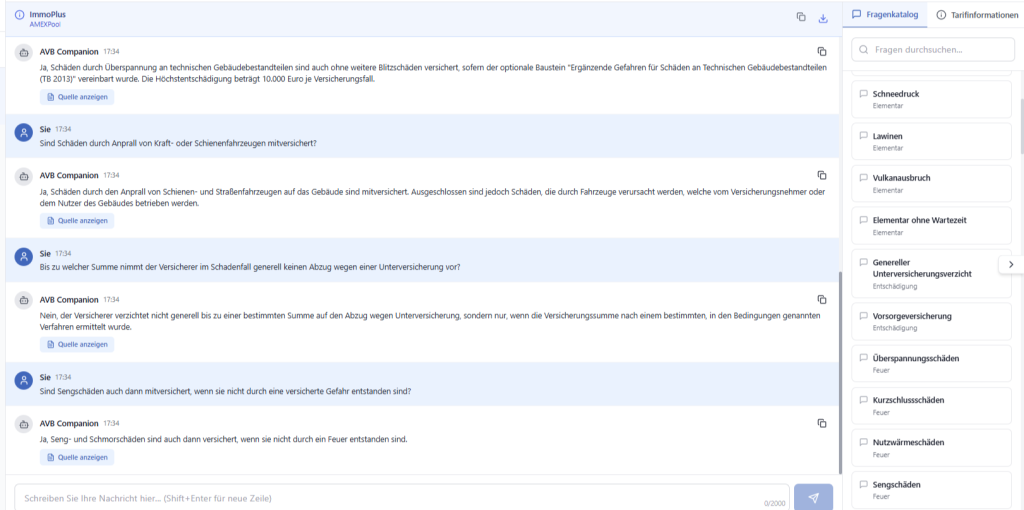 Der M&M Companion beantwortet Kundenanfragen zu Leistungen sofort und zuverlässig. Dabei liefert er nicht nur eine klare Antwort, sondern verweist direkt auf die passende Stelle in den AVB (soweit verfügbar). So sind die Aussagen transparent, nachvollziehbar und rechtlich fundiert.