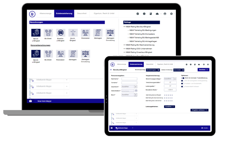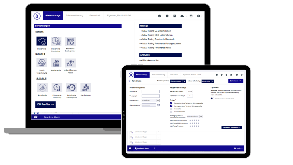 Mit Modulen für Altersvorsorge, Kranken-, Lebens- und Sachversicherungen vereint M&M Office alles, was Sie für Beratung und Abschluss brauchen – in einem System.