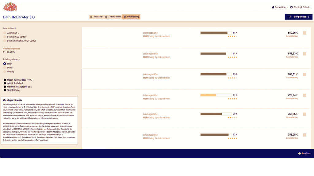 Mit unserem PKV-Leistungsfallszenario wird Beratung greifbar. Hinterlegen Sie beim PKV-Vergleich beispielhafte Arztrechnungen – z. B. für Zahnbehandlung, Massagen oder andere Leistungen – und M&M Office zeigt Ihnen wie hoch der Eigenanteil in jedem Tarif tatsächlich wäre. Beitrag und Eigenleistung werden zu einer realistischen Gesamtbelastung verrechnet. So erkennt der Kunde in Euro und Cent, was ein günstiger Tarif wirklich kostet – und warum Qualität sich auszahlt.